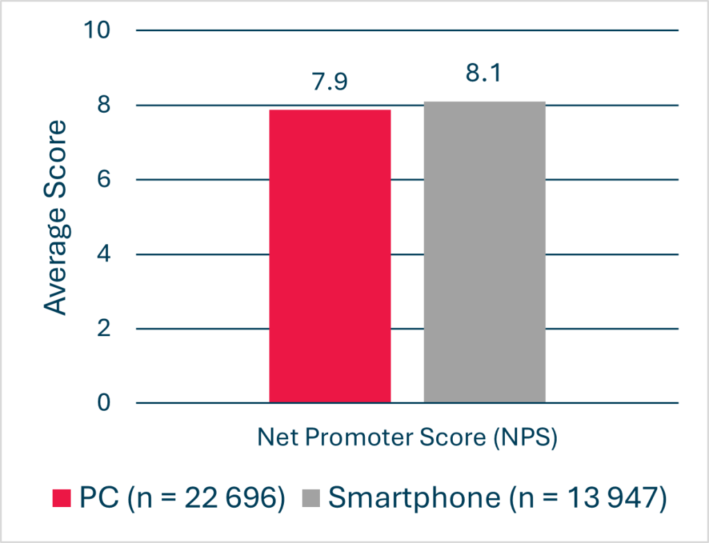 The average NPS for PC users was 7.9, while smartphone users scored slightly higher at 8.1.